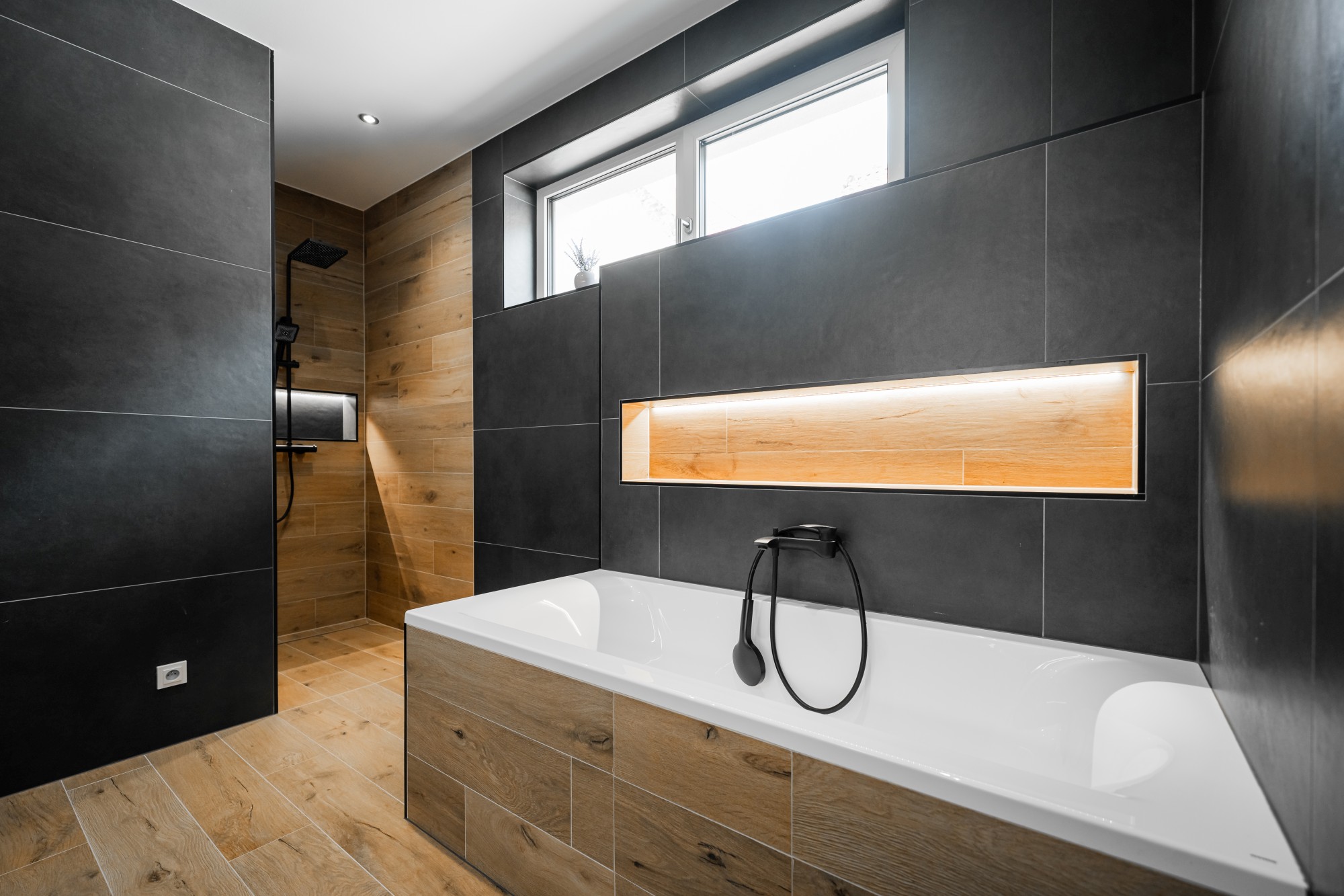 Výrazně kontrastní tmavý obklad a imitace dřeva doplněná o praktické osvětlené niky.