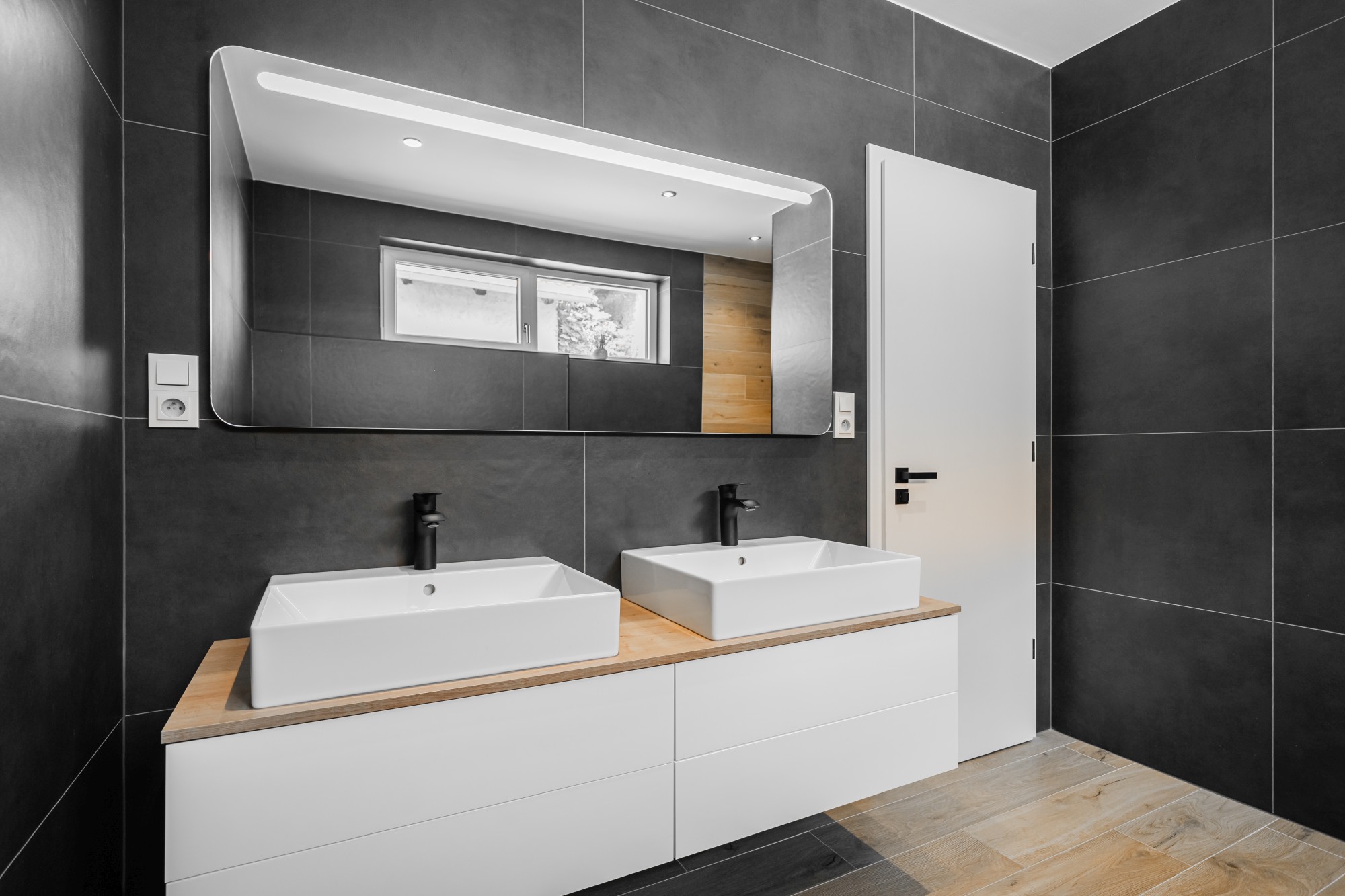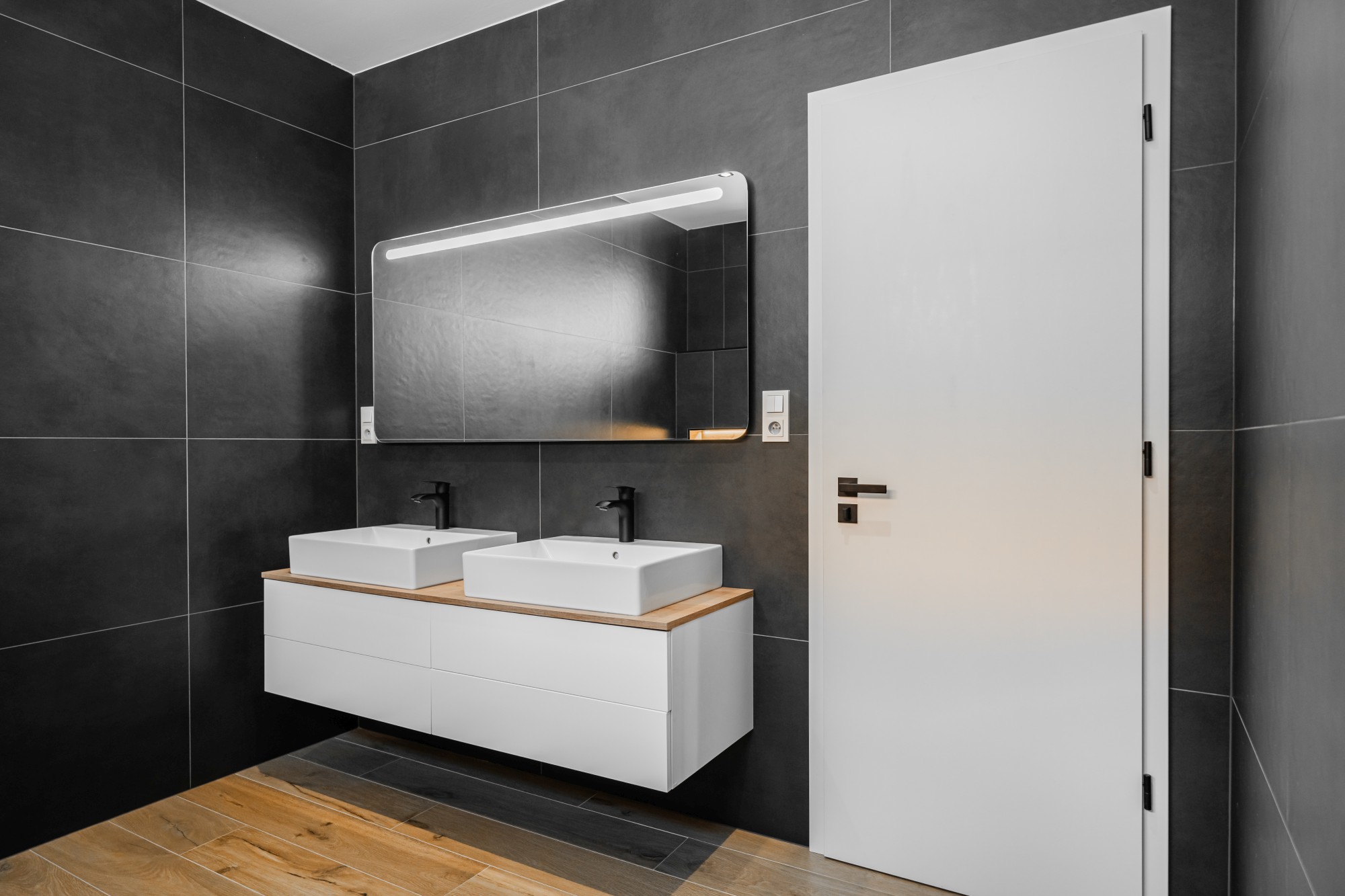 Koupelna a WC v tmavém designu, Vrbová Lhota